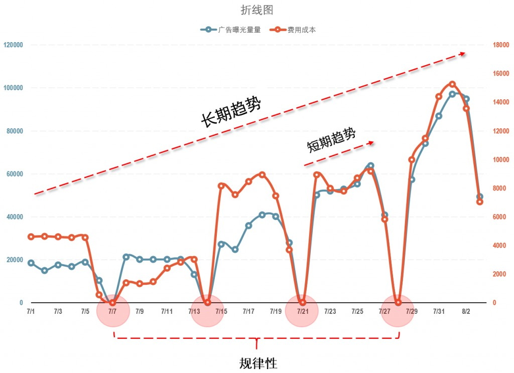 为了更清晰的对比这两组数据的变化和趋势,我们使用双坐标轴折线图,其中主坐标轴用来绘制广告曝光量数据,次坐标轴用来绘制费用成本的数据。通过折线图可以发现,费用成本和广告曝光量两组数据的变化和趋势大致相同,从整体的大趋势来看,费用成本和广告曝光量两组数据都呈现增长趋势。从规律性来看费用成本和广告曝光量数据每次的最低点都出现在同一天。从细节来看,两组数据的短期趋势的变化也基本一致。