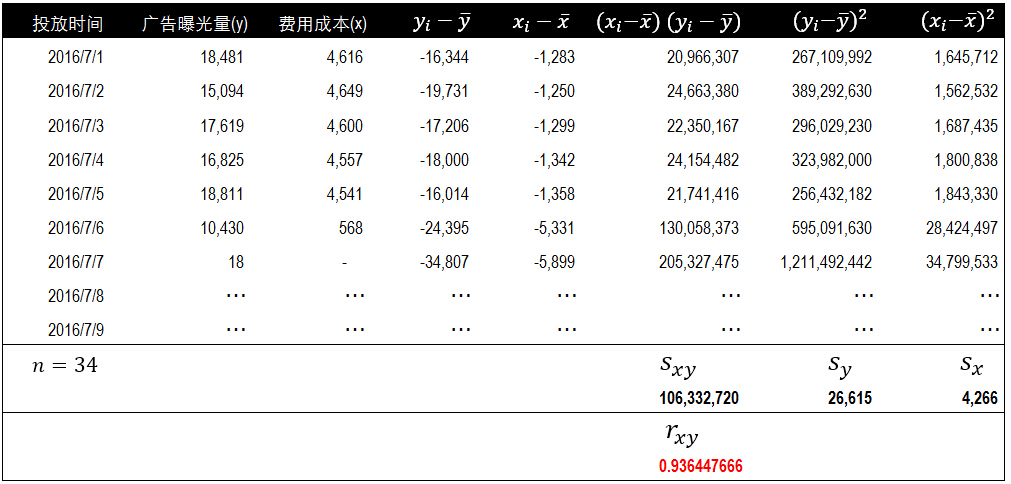 下面是广告曝光量和费用成本间协方差的计算过程和结果,经过计算,我们得到了一个很大的正值,因此可以说明两组数据间是正相关的。广告曝光量随着费用成本的增长而增长。在实际工作中不需要按下面的方法来计算,可以通过Excel中COVAR()函数直接获得两组数据的协方差值。