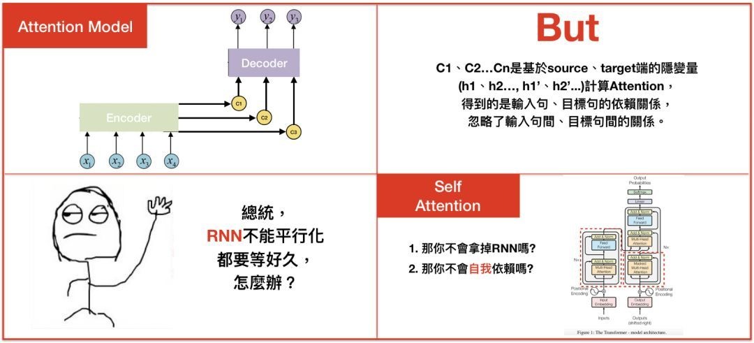 Attention model虽然解决了输入句仅有一个context vector的缺点,但依旧存在不少问题。1.context vector计算的是输入句、目标句间的关联,却忽略了输入句中文字间的关联,和目标句中文字间的关联性,2.不管是Seq2seq或是Attention model,其中使用的都是RNN,RNN的缺点就是无法平行化处理,导致模型训练的时间很长,有些论文尝试用CNN去解决这样的问题,像是Facebook提出的Convolutional Seq2seq learning,但CNN实际上是透过大量的layer去解决局部信息的问题,在2017年,Google提出了一种叫做”The transformer”的模型,透过self attention、multi-head的概念去解决上述缺点,完全舍弃了RNN、CNN的构架。