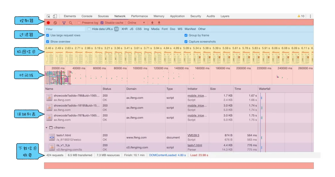 网络面板由控制器、过滤器、抓图信息、时间线、详细列表和下载信息概要这 6 个区域构成(如下图所示)。