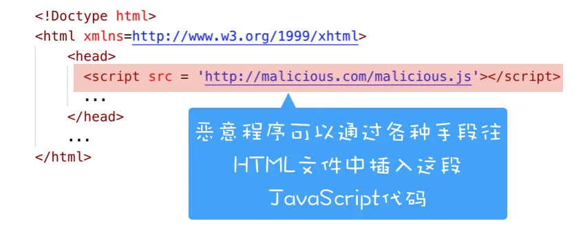 比如,恶意程序在 HTML 文件内容中插入如下一段 JavaScript 代码:
