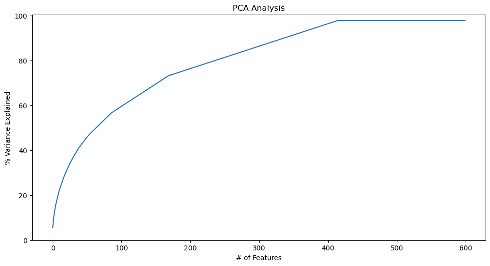 实践:前面DBSCAN实践中我们用PCA分析tf-idf向量主成分,确定主成分收敛在480维度左右。这里我们使用word2vec时,先给定600维度,然后在用pca来分析主成分,如果主成分收敛,这可以根据收敛确定维度。如果不收敛,可以适当扩大维度重新再看。最终发现word2vec收敛维度在420维度左右,比tf-idf要好一些。