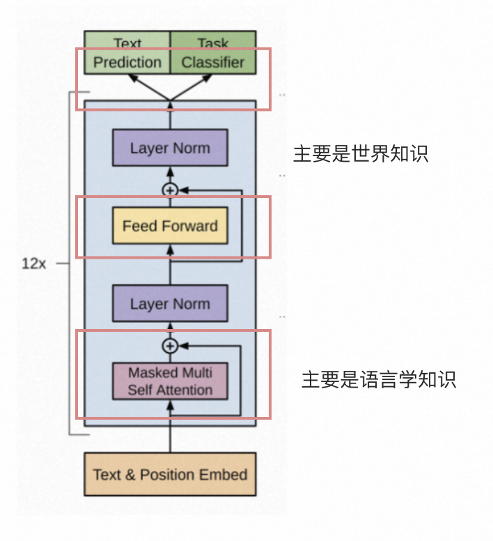参数 主要在Attention层和输出层,其中Attention层在训练中主要捕获的是语言学知识,参数 主要反应词与词之间的关系模型,FeedForward和Linear输出层主要捕获的是世界知识,参数 主要反应的是知识的结构化表达。