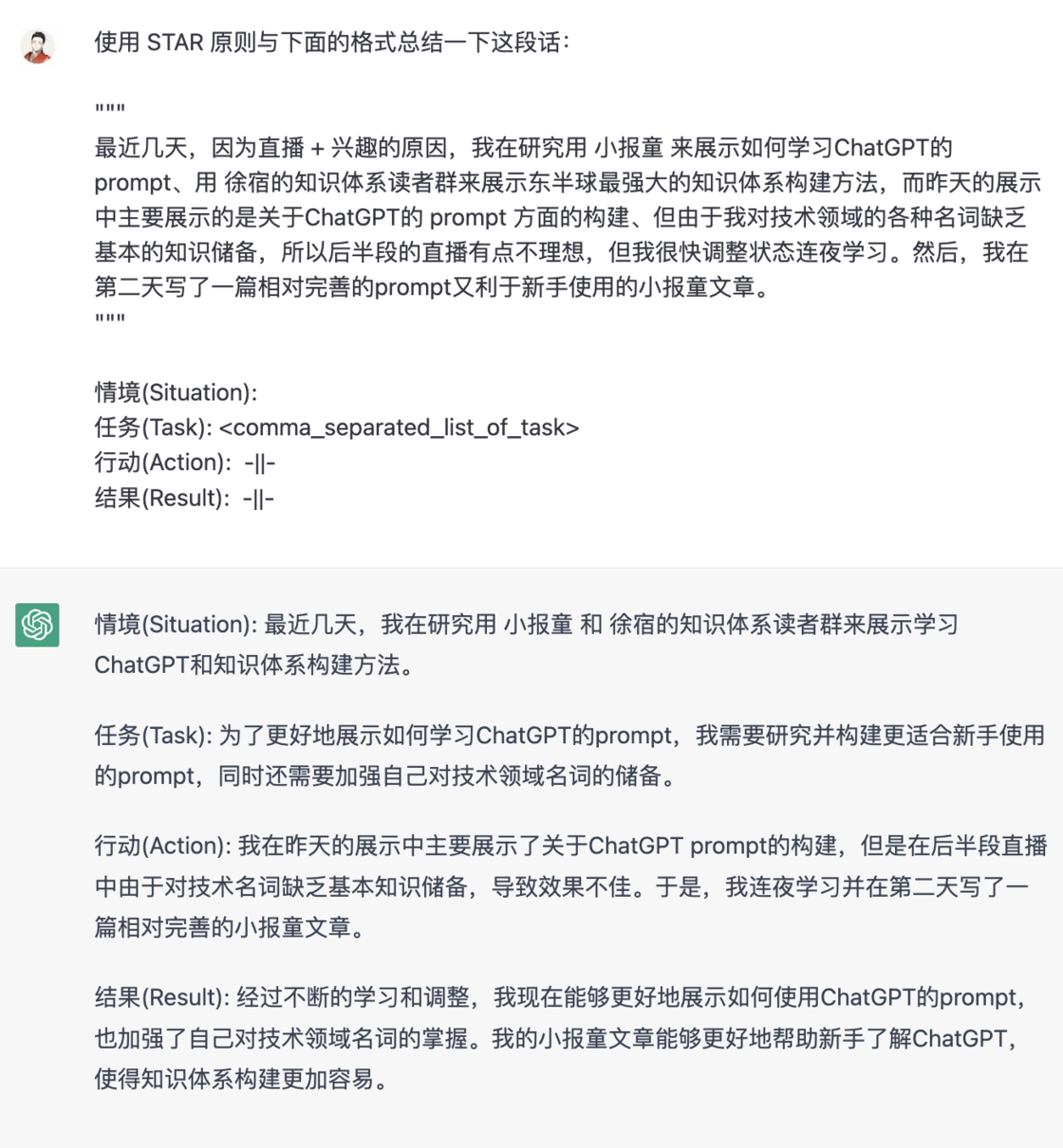 使用 STAR 原则与下面的格式总结一下这段话: