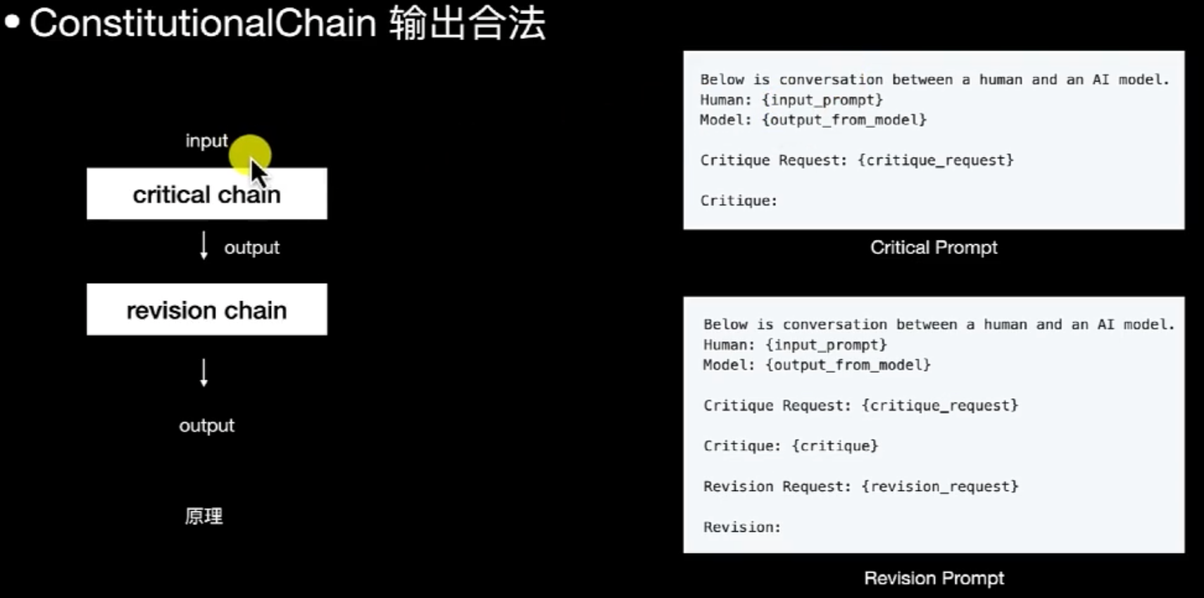 Langchain有2种典型SequentialChain: • ConstitutionalChain 宪法链,保证输出结果符合法律规定,输出合法; • OpenAlModerationChain 合规链,检测输入内容是否符合伦理道德,输入合规;