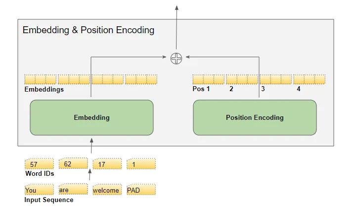 深度学习模型一次处理一批训练样本。嵌入层和位置编码层对一批序列样本的矩阵进行操作。嵌入层接受一个 (samples, sequence_length) 形状的二维单词ID矩阵,将每个单词ID编码成一个单词向量,其大小为 embedding_size,从而得到一个(samples, sequence_length, embedding_size) 形状的三维输出矩阵。位置编码使用的编码尺寸等于嵌入尺寸。所以它产生一个类似形状的矩阵,可以添加到嵌入矩阵中。
