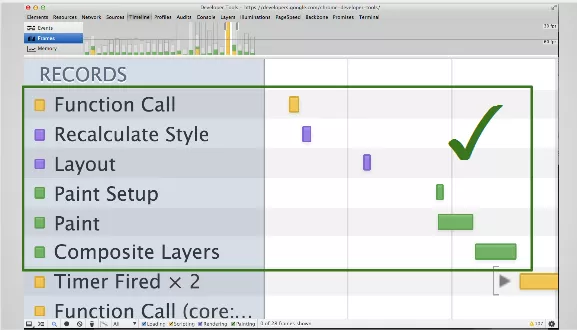 为了确保页面的流程,必须保证60fps内不发生两次渲染树更新,比如下图,16ms内只发生如下几个操作则是正常及正确的: