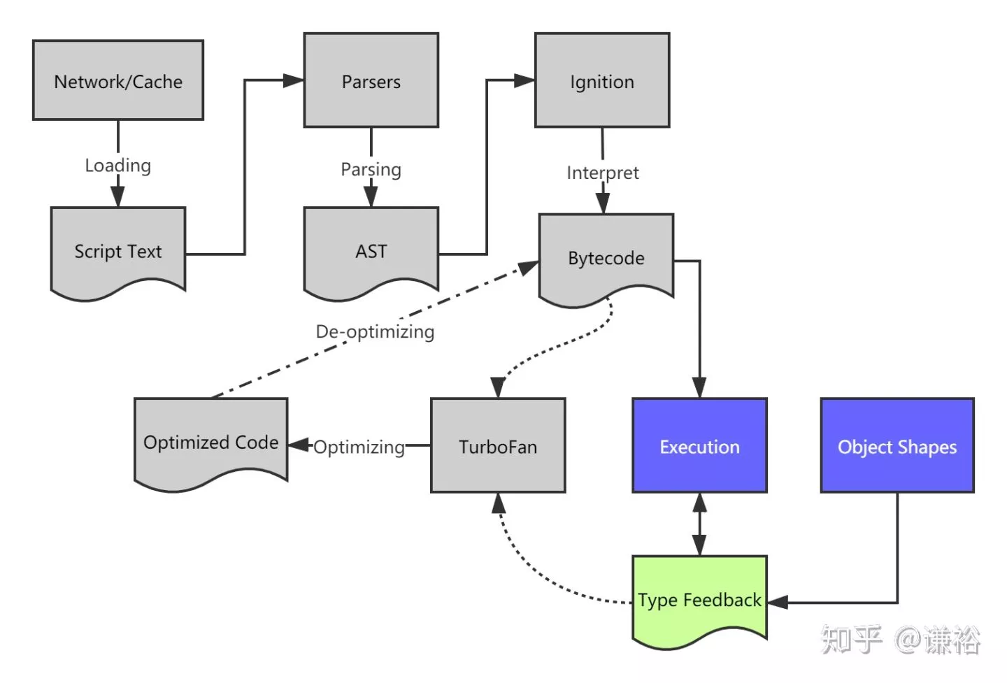 一个JavaScript脚本运行要经历加载、分析、解释执行、优化和反优化几个过程,其中Ignition负责将抽象语法树转化成字节码以节省存储空间,TurboFan则根据对象类型信息将部分函数的字节码编译成机器码加速执行。编译后的函数运行过程中发现对象类型变化了则回退到字节码解释阶段执行。