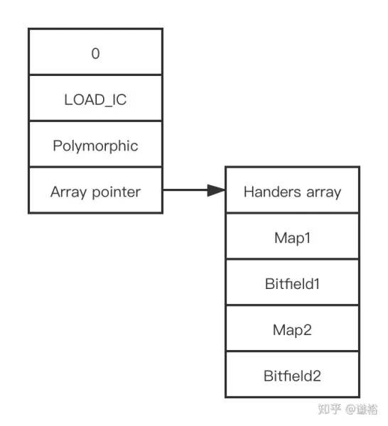 反馈向量与数据库表结构相似,0代表在表中的位置 LOAD_IC代表操作的类型 Monomorphic是当前这条反馈向量的状态是单态,状态是IC中非常重要的概念,除了单态还有多态(Polymorphic)和复态(Megamorphic)。在函数运行过程中随着参数类型的变化,状态可能会发生变化。 Map中存放对象的类型信息。 Bitfield中放置对象属性的信息。